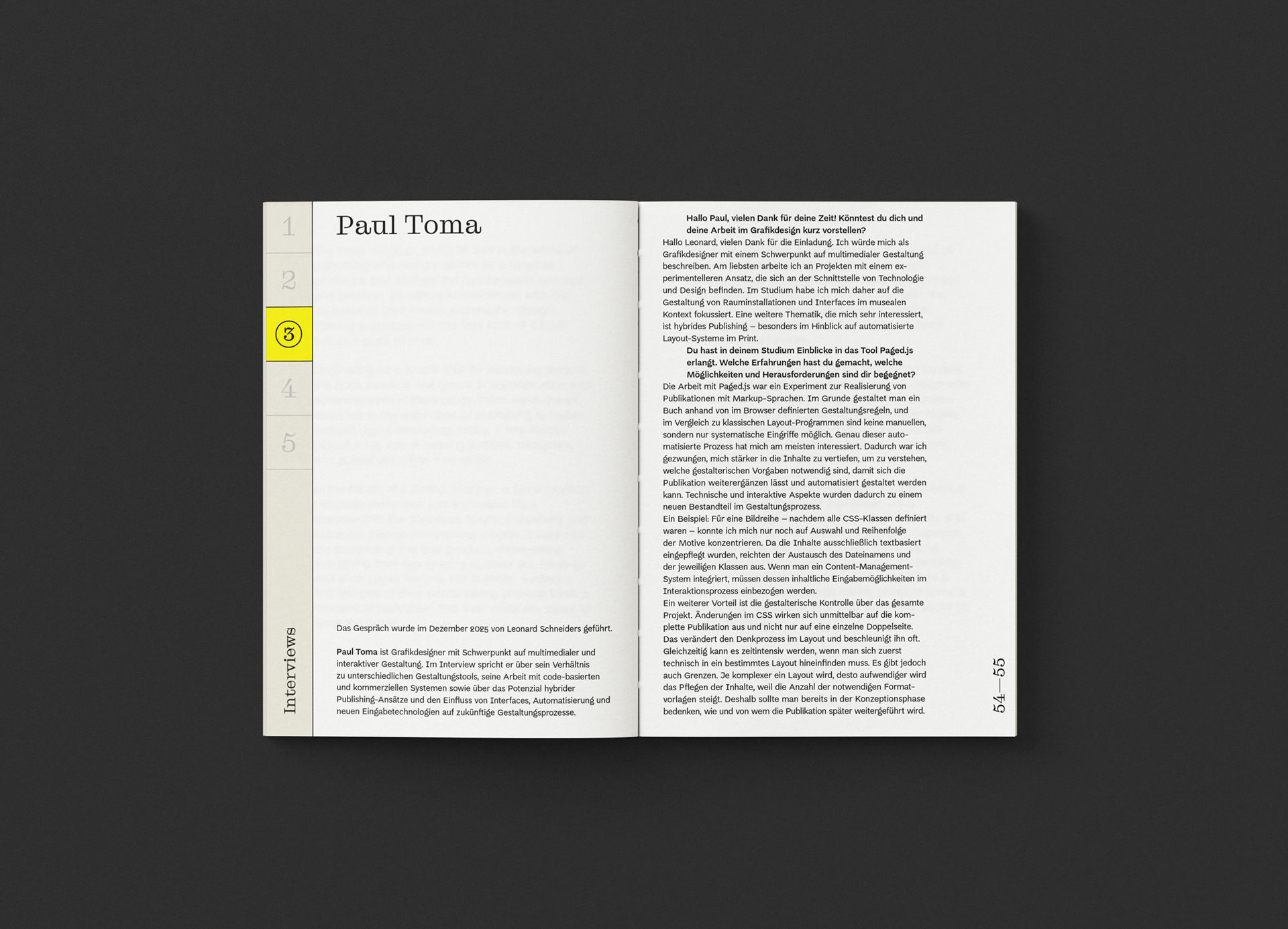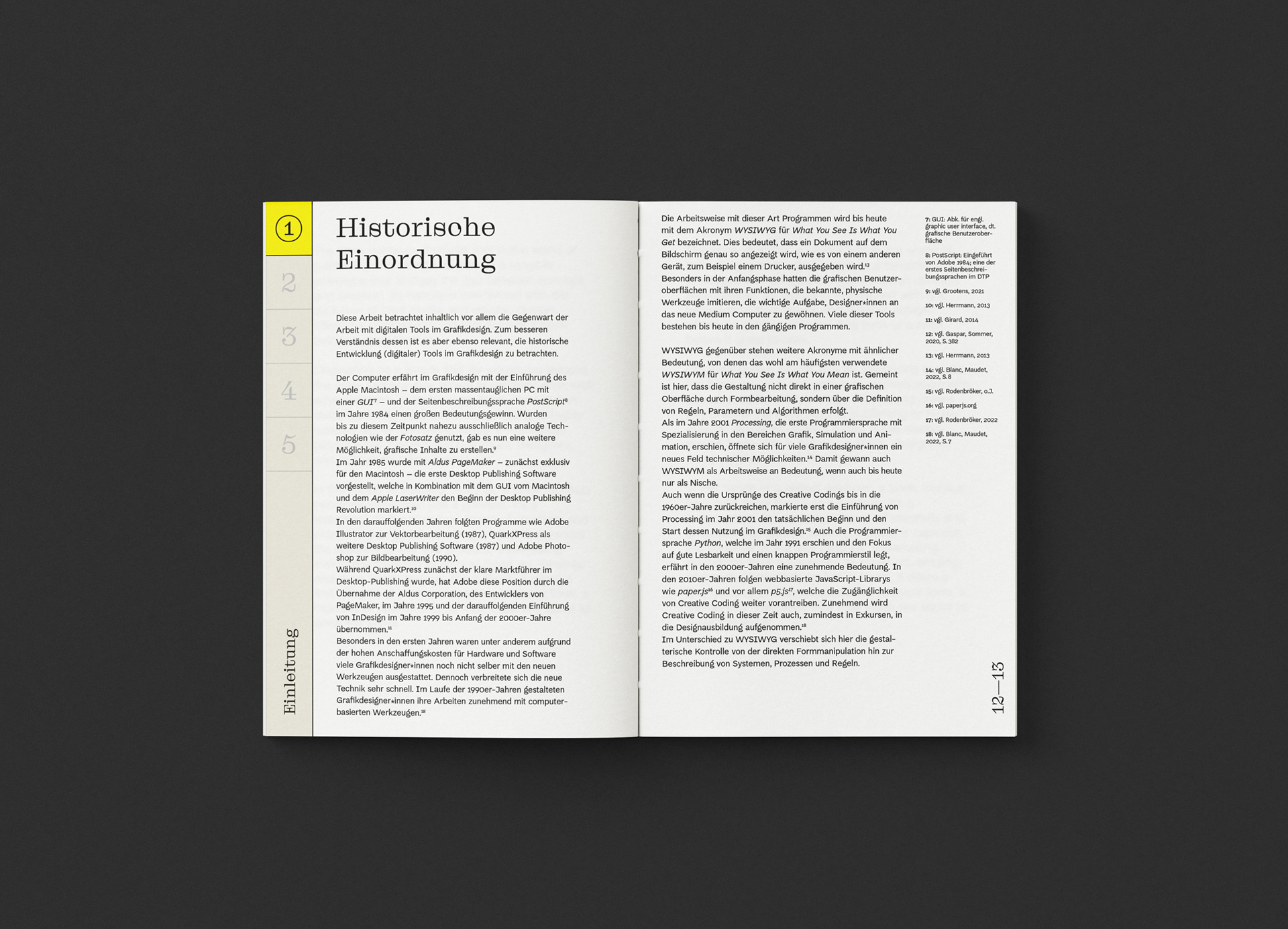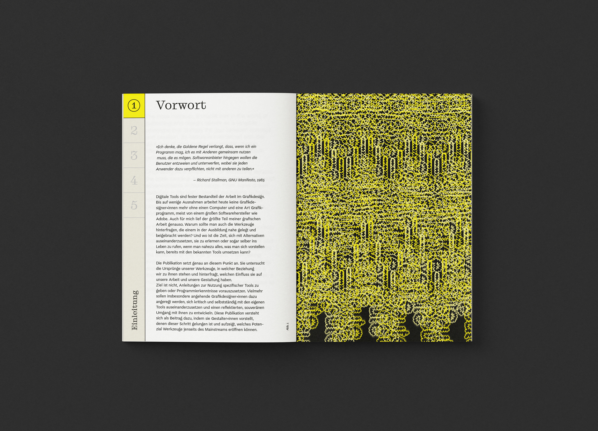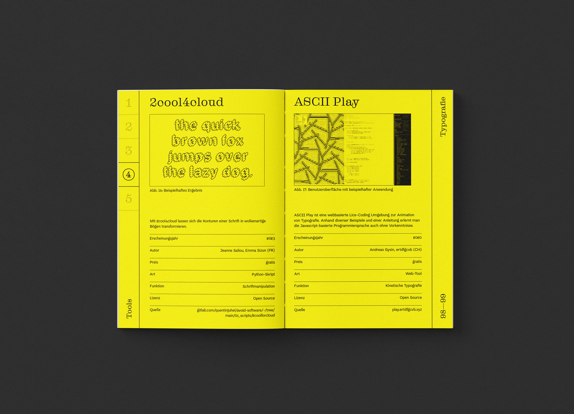 Welche Rolle nehmen die digitalen Tools, die wir nutzen, in unserer Gestaltung ein? Die Publikation Explore—Evaluate—Execute nähert sich dieser Frage aus unterschiedlichen Perspektiven. Sie entdeckt die Vielfalt digitaler Tools jenseits gängiger Standardsoftware und hinterfragt, in welcher Beziehung wir zu unseren Tools stehen. Die Auseinandersetzung erfolgt sowohl theoretisch – in Form von Texten und Interviews – als auch praktisch durch ein Glossar mit verschiedenen, leicht zu erlernenden Tools sowie durch experimentelle Formfindungsversuche mit unterschiedlichen Werkzeugen zur Verarbeitung von Typografie und Bildmaterial. Besonders angehende Grafikdesigner*innen sollen dadurch angeregt werden, die Wahl ihrer Tools kritisch zu hinterfragen und einen reflektierten, selbstbewussten Umgang mit ihnen zu entwickeln.