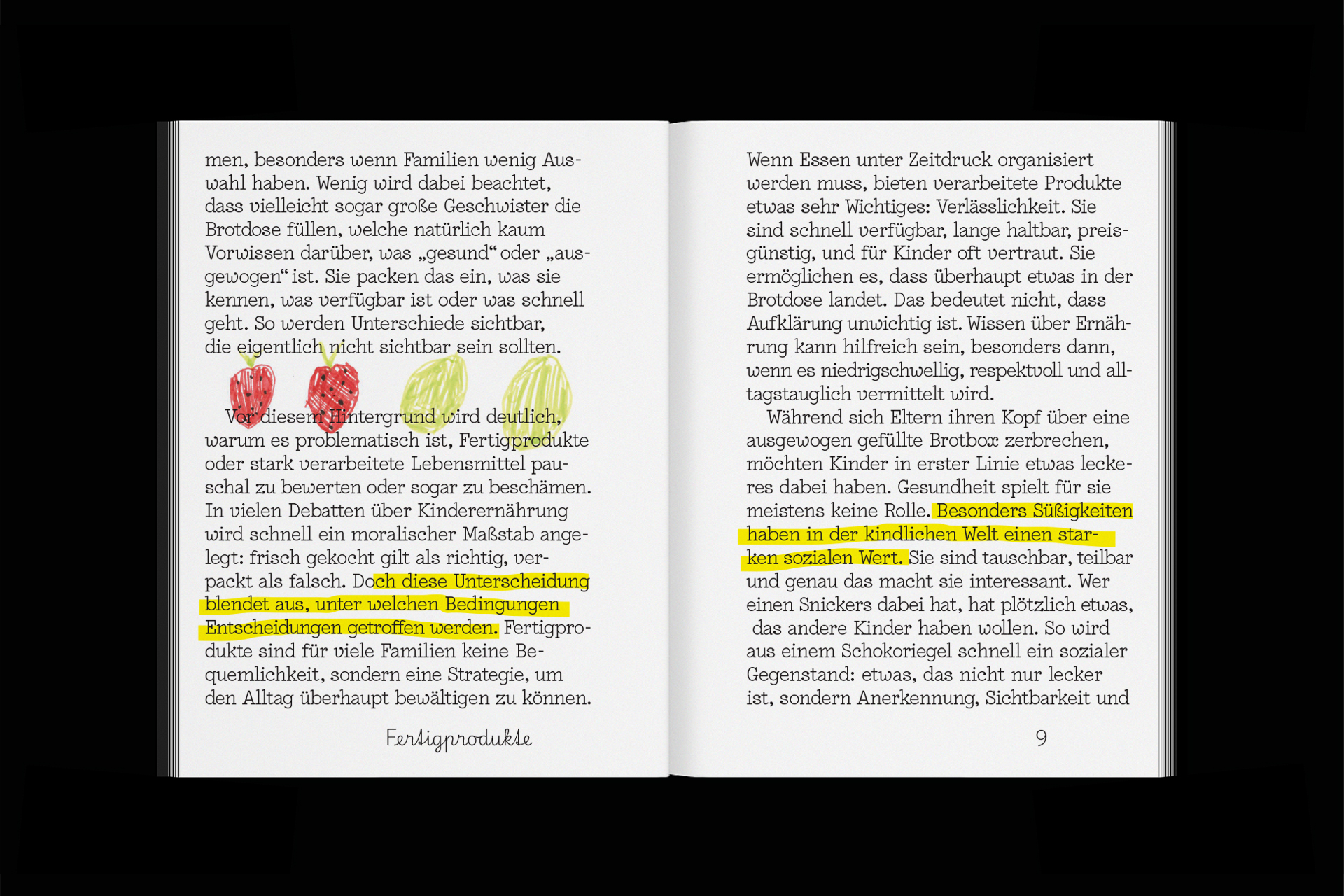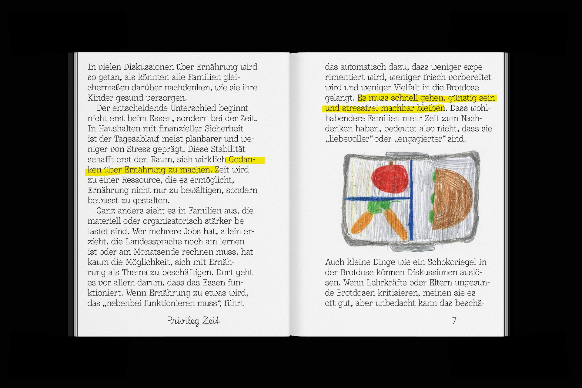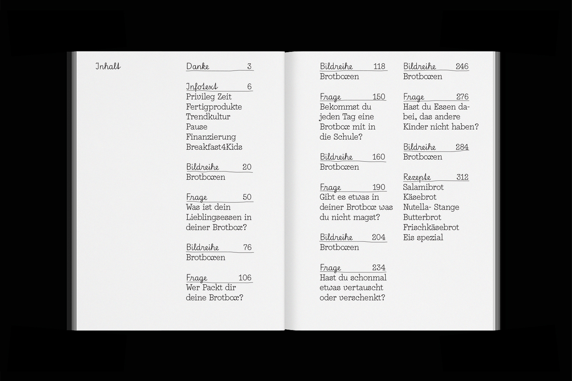 Die Publikation Ich bekomme jeden Tag meine Brotdose mit stellt eine kritische Auseinandersetzung mit den sozialen, kulturellen und familiären Faktoren, die in die Kindesernährung einfließen, dar. Sie beleuchtet diese anhand von Pausenbroten, die Grundschulkindern mitgegeben werden. Außerdem haben die Kinder selbst durch ihre Beschreibungen und Assoziationen dazu beigetragen, einen Einblick in Lebensrealitäten zu erlangen, die einem sonst verborgen sind. Sie haben dem Buch durch ihre Handschriften und Illustrationen Tiefe verliehen.