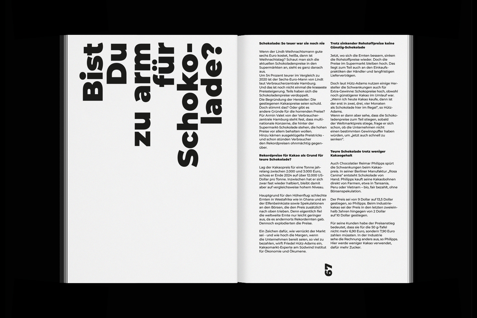 Die Publikation Nach dem Fest kommt der Rest thematisiert den bewussten Umgang mit Schokoladenresten nach Feiertagen. Sie verbindet Wissensvermittlung (Geschichte, Herkunft, Konsum und globale Bedeutung von Schokolade) mit praktischen Rezeptideen, um übrig gebliebene Schokolade kreativ weiterzuverwenden. Zentrale Aspekte sind Nachhaltigkeit, Lebensmittelwertschätzung, Konsumverhalten sowie der Übergang von Schokolade als Luxusgut zum Massenprodukt.