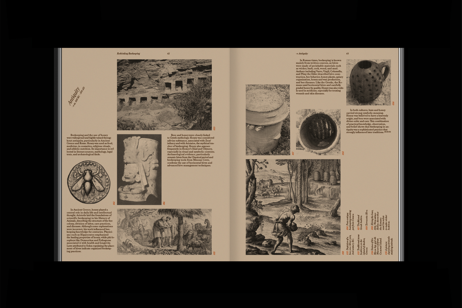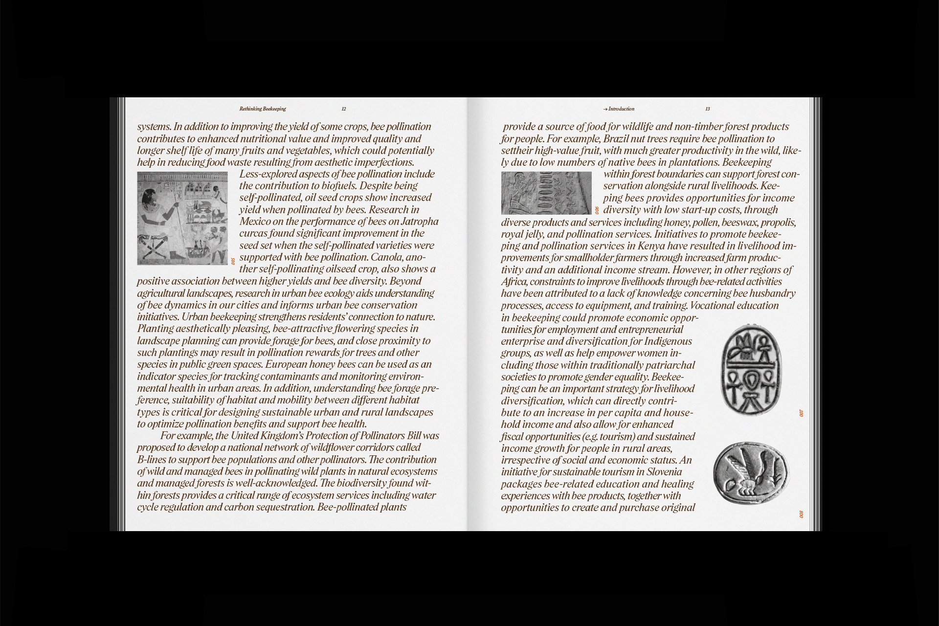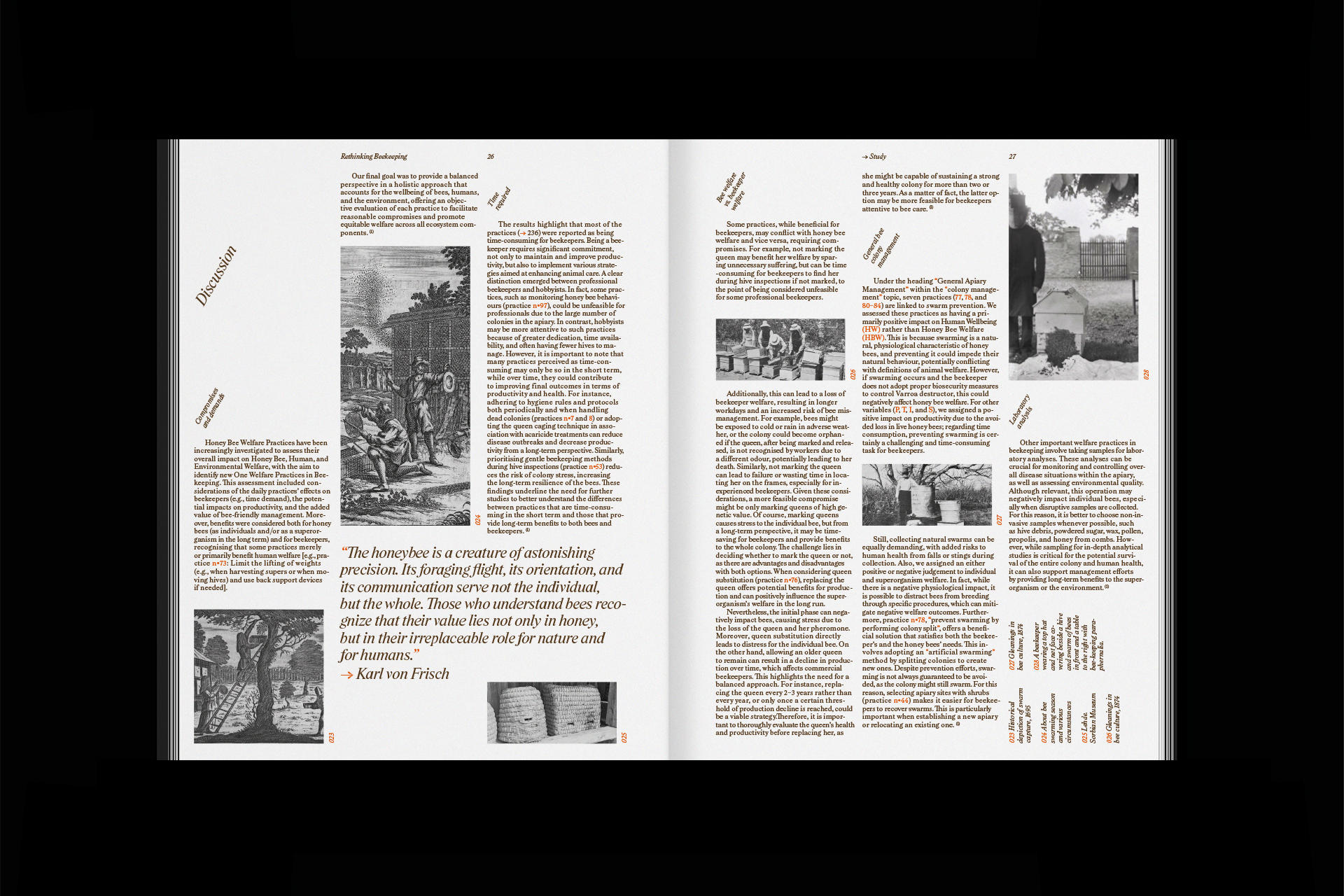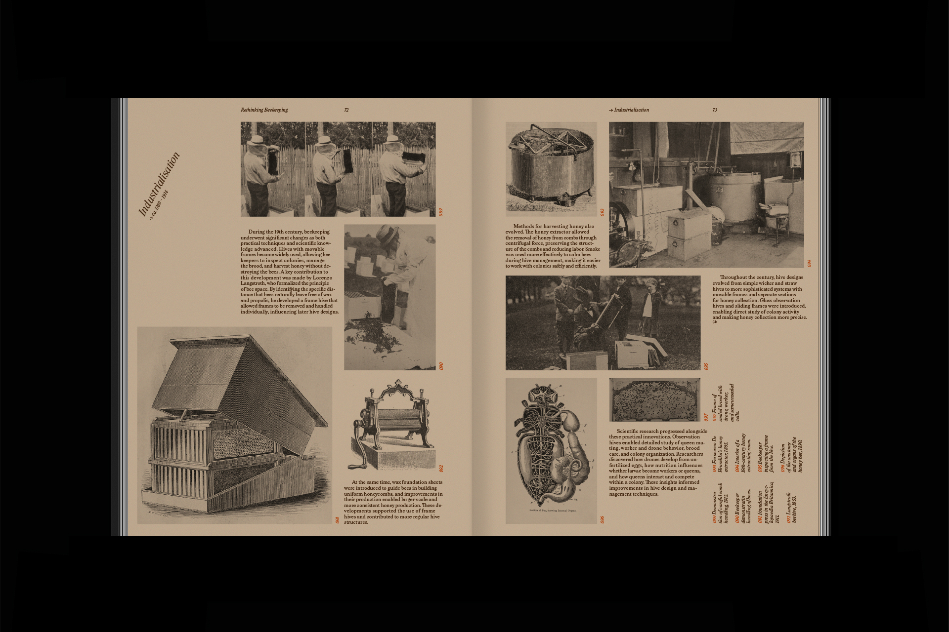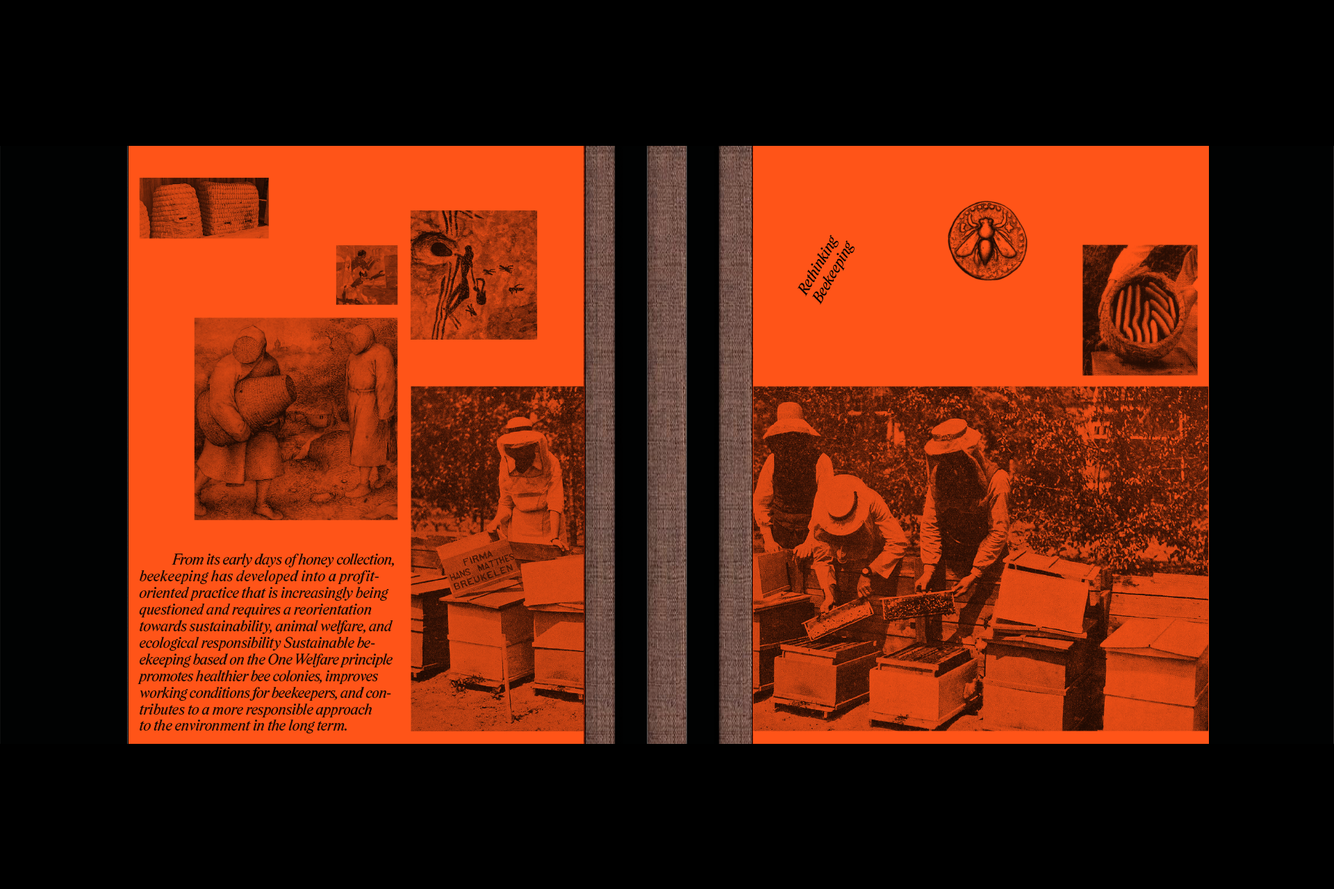 Das Projekt Rethinking Beekeeping beschäftigt sich mit der heutigen Imkerei und ihrem Einfluss auf Bienen, Umwelt und den Menschen. Viele gängige Praktiken sind zu stark auf schnellen Profit ausgerichtet. Ziel des Projekts ist es, diese Formen der Imkerei zu analysieren und nachhaltigere Alternativen aufzuzeigen. Dabei dient das One-Welfare-Prinzip als Grundlage, das Tierwohl, die Natur und die Arbeitsbedingungen gemeinsam betrachtet und gegenüber stellt. Das Projekt macht Probleme und Chancen der Imkerei sichtbar und fördert ein bewussteres Nachdenken und Handeln. Die Beziehung zwischen Bienen und Menschen reicht bis in die Steinzeit zurück und hat sich bis heute zu einer gewissen Abhängigkeit gewandelt. Es ist wichtig die zukünftige Entwicklung kritisch zu betrachten und das Wohl der Bienen zu schützen.
